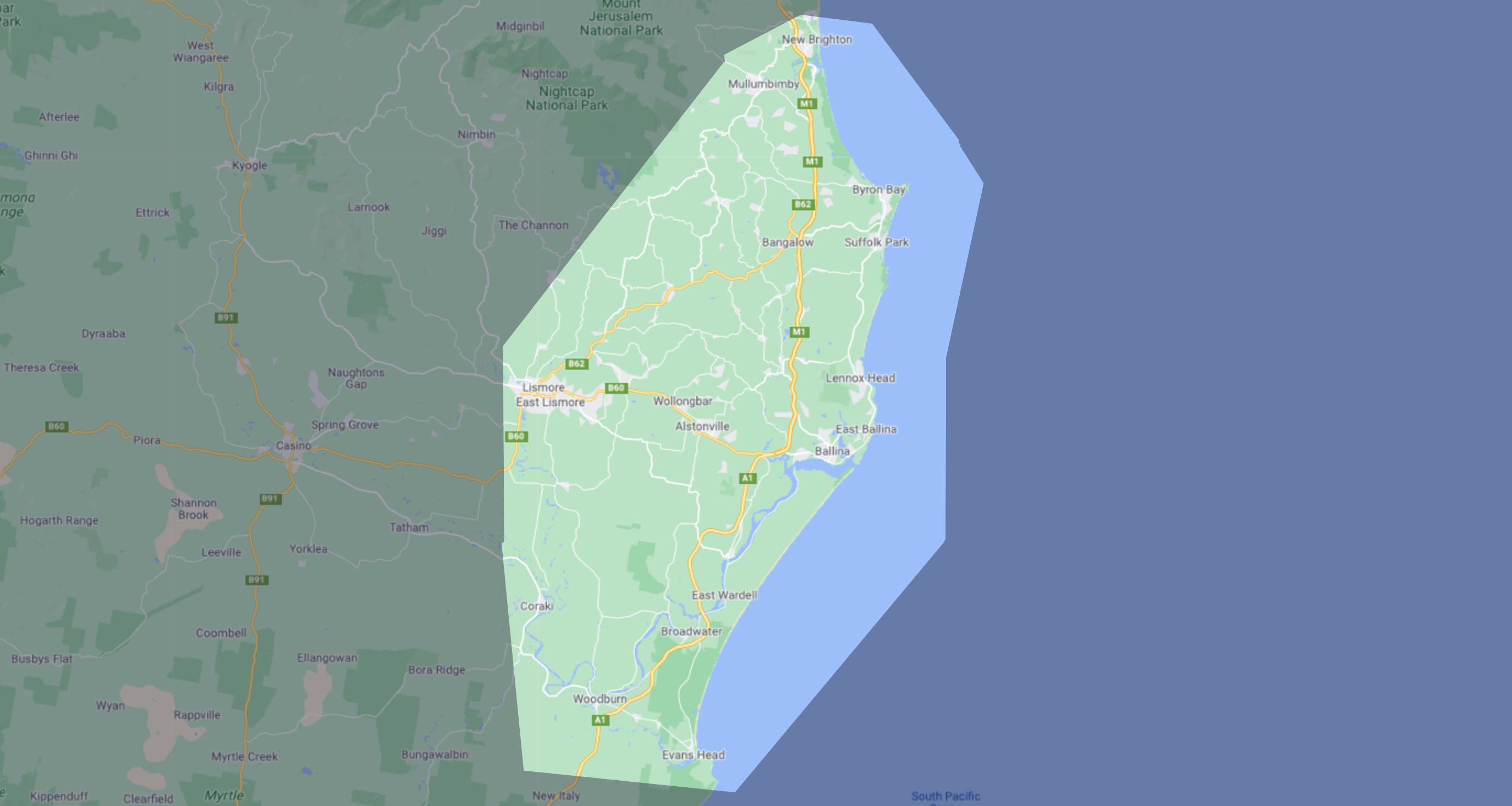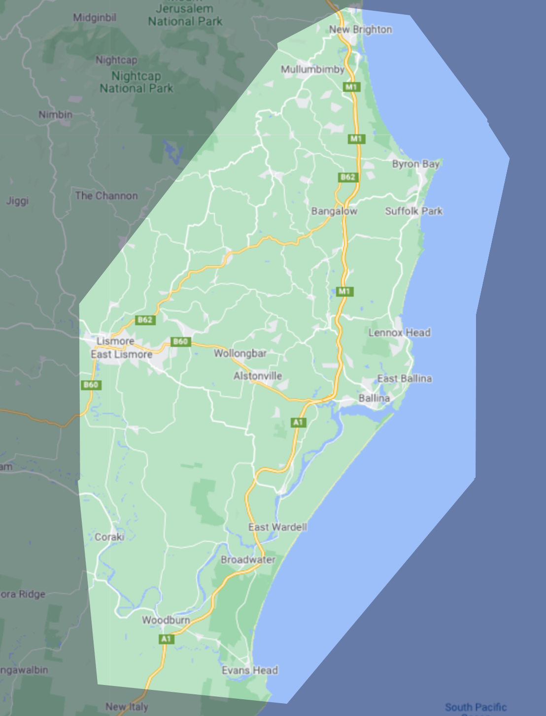 Evans Head to Brunswick Heads and across the Lismore region. All other areas by negotiation.